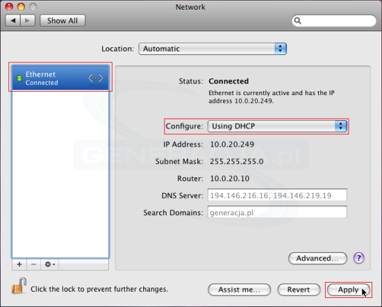 STEP 3.1: [KONFIGURACJA AUTOMATYCZNA] W oknie Network zaznaczamy odpowiednie połączenie Ethernet i z listy Configure wybieramy Using DHCP oraz klikamy Apply: