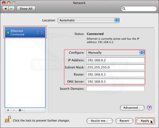 STEP 3.2: [KONFIGURACJA RĘCZNA] W oknie Network zaznaczamy odpowiednie połączenie Ethernet i z listy Configure wybieramy Manually, następnie konfigurujemy aktywne pola oraz klikamy Apply.