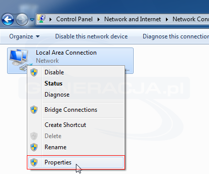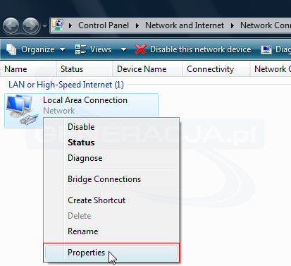 STEP 4: W oknie Połączenia sieciowe klikamy prawym przyciskiem myszki na wybranym Połączeniu lokalnym i z menu wybieramy Właściwości: