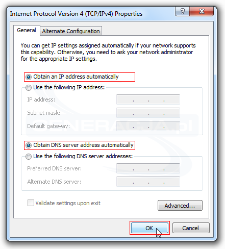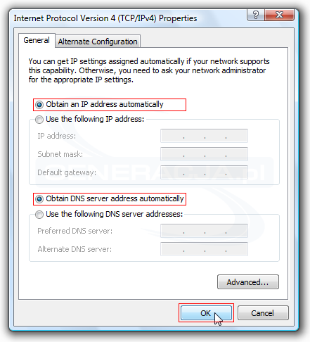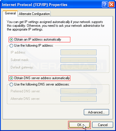 STEP 5.1: [KONFIGURACJA AUTOMATYCZNA] Aby pobrać ustawienia połączenia sieciowego z serwera DHCP należy w oknie Właściwości: Protokół internetowy (TCP/IP) zaznaczyć opcję Uzyskaj adres IP automatycznie oraz Uzyskaj adres serwera DNS automatycznie i kliknąć OK.