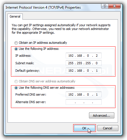 STEP 5.2: [KONFIGURACJA RĘCZNA] Aby wprowadzić ręczne ustawienia połączenia sieciowego należy w oknie Właściwości: Protokół internetowy (TCP/IP) zaznaczyć opcję Użyj następującego adresu IP oraz Użyj następujących adresów serwerów DNS, skonfigurować odpowiednio aktywne pola i kliknąć OK.