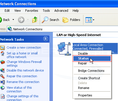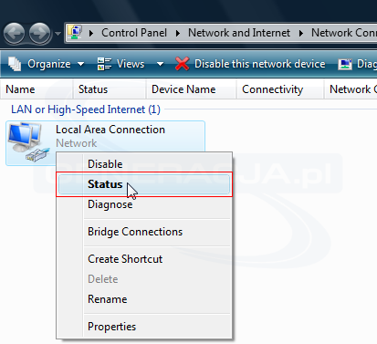 STEP 6.1: Aby sprawdzić stan naszego połączenia należy w oknie Połączenia sieciowe kliknąć prawym przyciskiem myszki na wybranym Połączeniu lokalnym i z menu wybrać Stan: