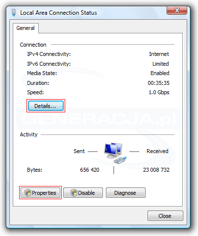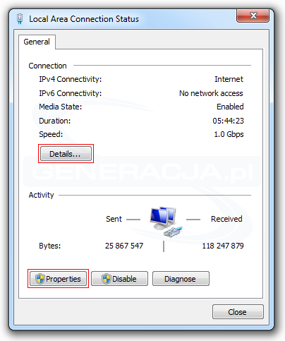 STEP 7.2: W oknie Stan: Połączenie lokalne możemy przejrzeć szczegółowe informacje na temat połączenia klikając w Szczegóły..., sprawdzić jego aktywność, zdiagnozować (Diagnozuj), gdy występują problemy oraz przejść do konfiguracji klikając we Właściwości: