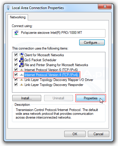 STEP 5: W oknie Właściwości: Połączenie lokalne zaznaczamy Protokół internetowy w wersji 4 (TCP/IPv4) i klikamy we Właściwości: