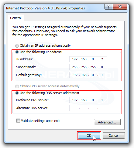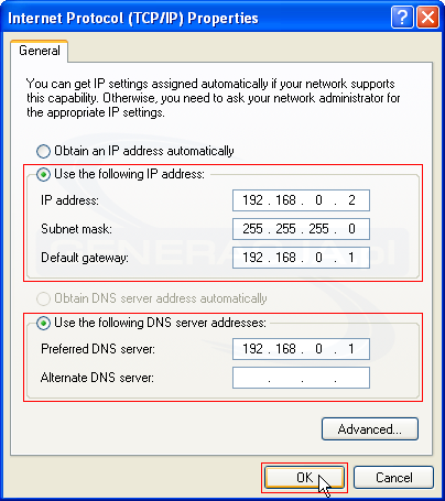 W przykładzie nasza konfiguracja zakłada, że łączymy się z Internetem przy pomocy routera, którego adres wewnętrzny to 192.168.0.1: