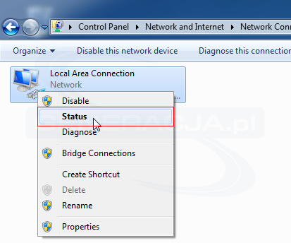 STEP 7.1: Aby sprawdzić stan naszego połączenia należy w oknie Połączenia sieciowe kliknąć prawym przyciskiem myszki na wybranym Połączeniu lokalnym i z menu wybrać Stan: