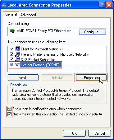 STEP 4: W oknie Właściwości: Połączenie lokalne zaznaczamy Protokół internetowy (TCP/IP) i klikamy we Właściwości. Warto włączyć sobie również opcje powiadamiania o stanie połączenia: