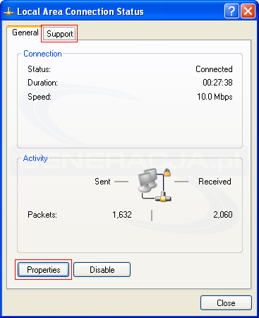 STEP 6.2: W oknie Stan: Połączenie lokalne możemy przejrzeć szczegółowe informacje na temat połączenia wybierając zakładkę Obsługa oraz przejść do konfiguracji klikając we Właściwości: