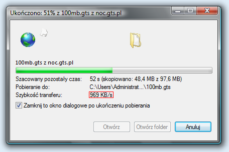 Systemy komputerowe, w szczególności Windows, wyrażają prędkości w kB/s (kilobajty na sekundę). Dlatego przy ściąganiu widzimy wartości niższe niż te, które zapisane są w umowie. W umowie widzimy 256kb/s (kilobitów na sekundę). Windows natomiast pokazuje 32kB/s (kilobajty na sekundę). Różnica wynika z zastosowania innych jednostek.