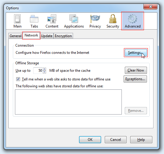 STEP 2: W oknie Options wybieramy menu Advanced. Następnie przechodzimy do zakładki Network i wybieramy w niej Settings...: