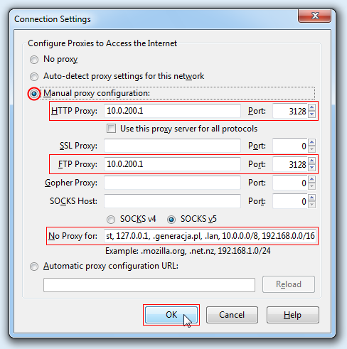 Aby poprawnie skonfigurować ręcznie obsługę serwera PROXY należy w polach HTTP Proxy i FTP Proxy wprowadzić adres IP 10.0.200.1 oraz w polach Port numer 3128. W polu No Proxy for wprowadzamy adresy localhost, 127.0.0.1, .generacja.pl, .lan, 10.0.0.0/8, 192.168.0.0/16 i klikamy OK: