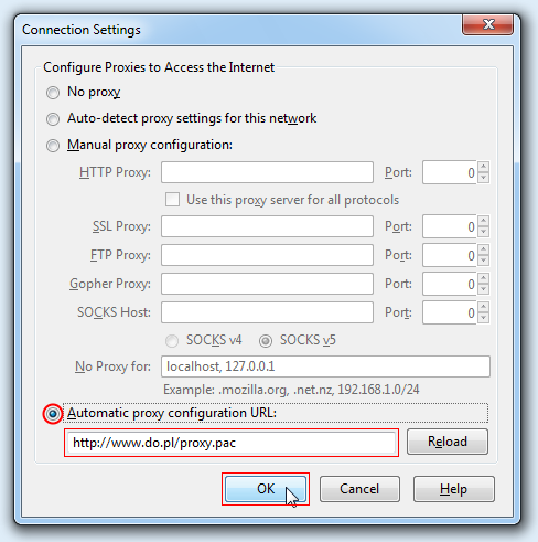 Aby skorzystać z konfiguracji automatycznej serwera PROXY należy w oknie Connection Settings zaznaczyć opcję Automatic proxy configuration URL: i w pustym polu wprowadzić adres http://www.do.pl/proxy.pac oraz kliknąć OK: