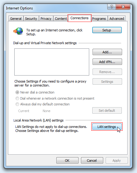 STEP 2: W oknie Internet Options przechodzimy do zakładki Connections i wybieramy w niej LAN settings: