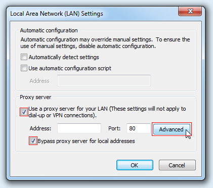 Aby poprawnie skonfigurować ręcznie obsługę serwera PROXY należy w oknie Local Area Network (LAN) Settings zaznaczyć opcję Use a proxy server for your LAN (...) i Bypass proxy server for local addresses oraz wybrać Advanced: