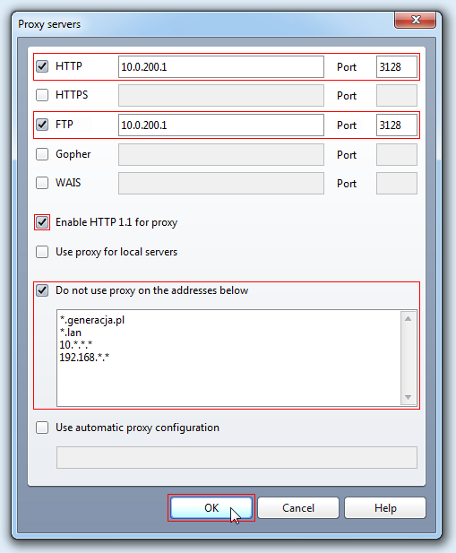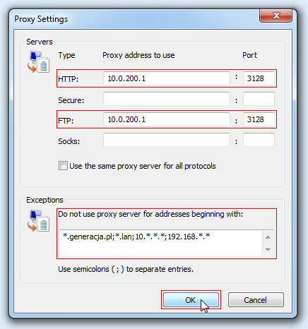 W polach Proxy address to use dla typów HTTP i FTP wprowadzamy adres IP 10.0.200.1 oraz w polach Port numer 3128. W polu Do not use proxy server for addresses beginning with wprowadzamy adresy *.generacja.pl;*.lan;10.*.*.*;192.168.*.* i klikamy OK: