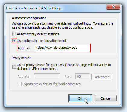 Aby skorzystać z konfiguracji automatycznej serwera PROXY należy w oknie Local Area Network (LAN) Settings zaznaczyć opcję Use automatic configuration script i w polu Address wprowadzić http://www.do.pl/proxy.pac oraz kliknąć OK: