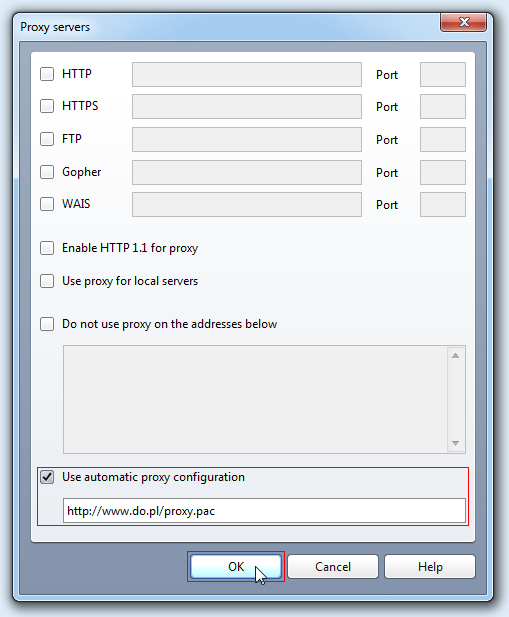 Aby skorzystać z konfiguracji automatycznej serwera PROXY należy w oknie Proxy servers zaznaczyć opcję Use automatic proxy configuration i w pustym polu wprowadzić adres http://www.do.pl/proxy.pac oraz kliknąć OK: