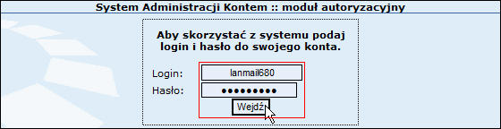 KROK 2: Przechodzimy do Systemu Zarządzania Kontem i logujemy się przy pomocy uzyskanego loginu oraz hasła. Operację zatwierdzamy przyciskiem Wejdź: